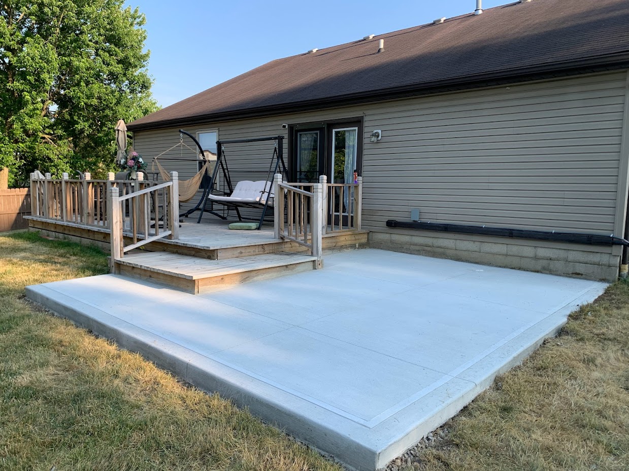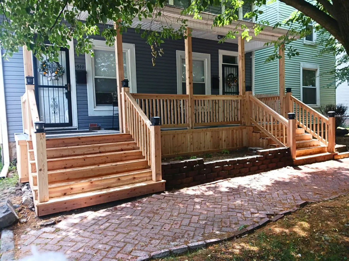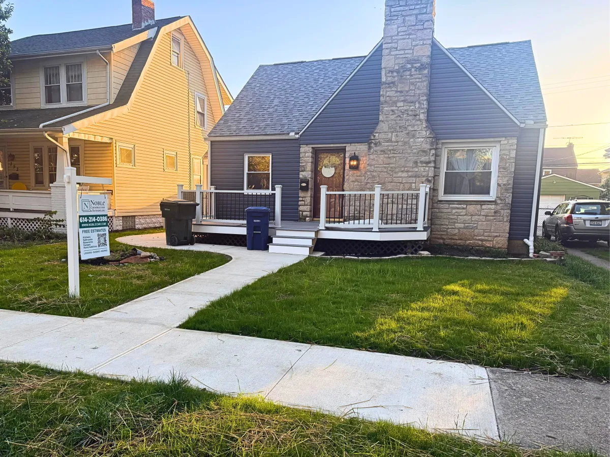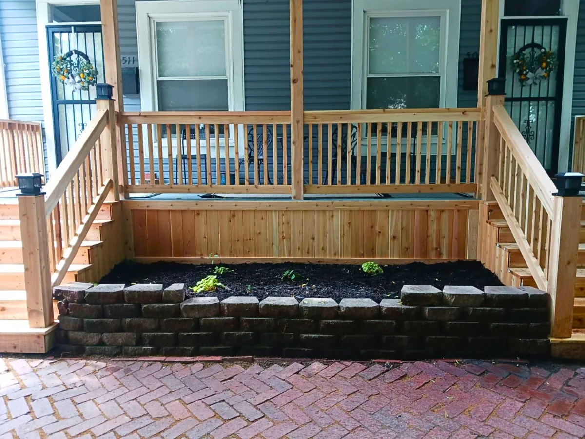 This front porch renovation project completely transformed the home’s entry with a custom-built porch, solid entry steps, and modern railings that improve both safety and curb appeal. A new concrete walkway creates a clean and welcoming path to the front entrance while complementing the home’s exterior design. The yard was professionally graded and reshaped to improve drainage, balance, and overall appearance. The result is a fresh, inviting front entry that enhances the home’s curb appeal and functionality.
